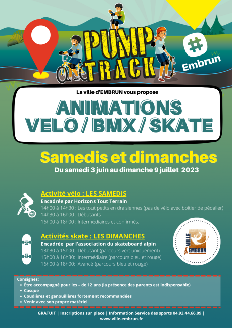 Ces animations se feront de façon alternée, sous forme d’initiations, de découvertes et de démonstrations avec l’organisation de « contest ».Elles seront encadrées par des intervenants diplômés de l’association Horizon tout terrain pour la partie vélo/bmx et l’association Skateboard alpin pour la partie skate avec une jauge de 100 personnes pour accueillir au mieux le public.