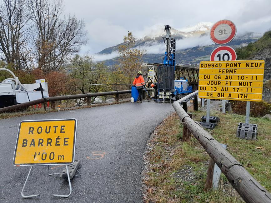 La réalisation de sondages géotechniques au Pont Neuf nécessite de réglementer la circulation pendant le durée des travaux réalisés par le Département des Hautes-Alpes du lundi 6 novembre 8h au vendredi 10 novembre 17h jour et nuit ainsi que du lundi 13 novembre au vendredi 17 novembre de 8h à 17h.