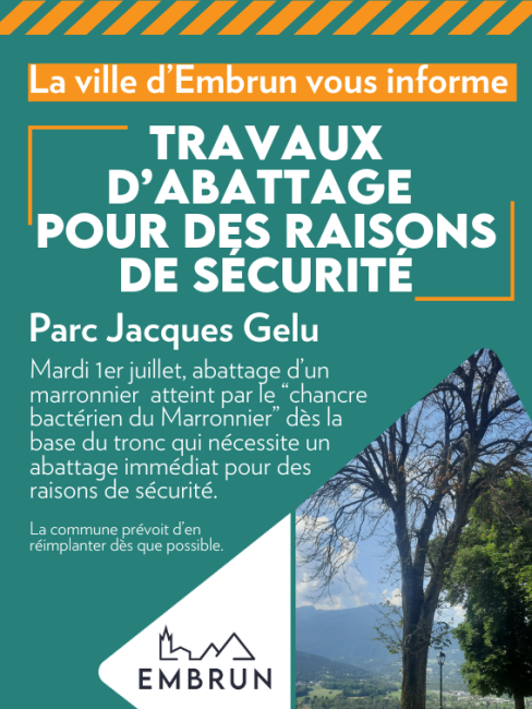 La ville d'Embrun vous informe de l'abattage d’un marronnier au parc Jacques Gélu atteint par le “chancre bactérien du Marronnier” dès la base du tronc qui nécessite un abattage immédiat pour des raisons de sécurité. Ces travaux d'abattage se dérouleront du 1er au 4 juillet 2025.