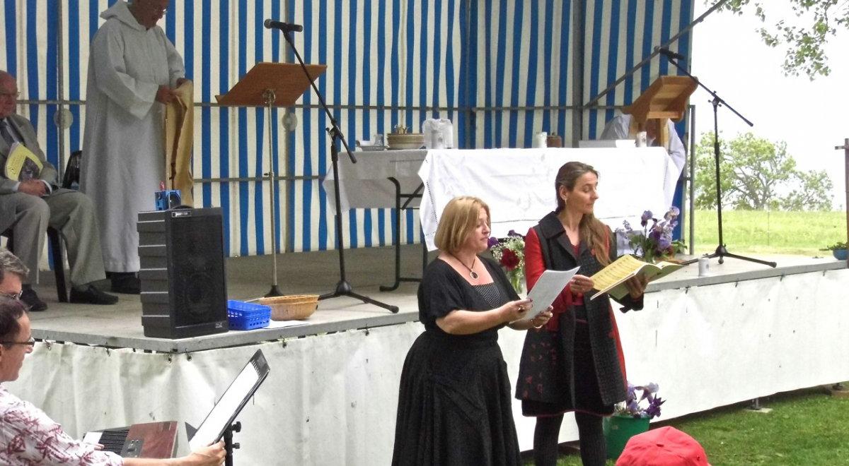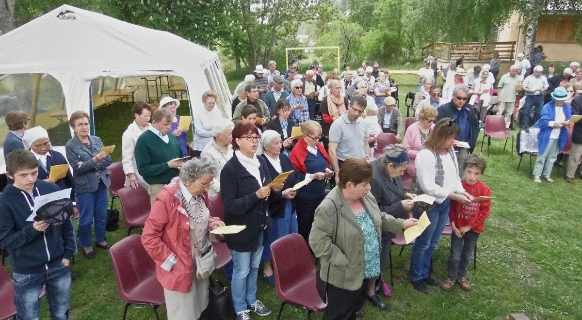 Ce 14 mai, jeudi de l'Ascension, le rassemblement traditionnel des paroisses de l'Embrunais Savinois a eu lieu à Puy Sanières. Le grand espace ombragé sous la mairie avait été aménagé avec un chapiteau, des tables, des chaises, une estrade couverte pour la célébration de la messe.